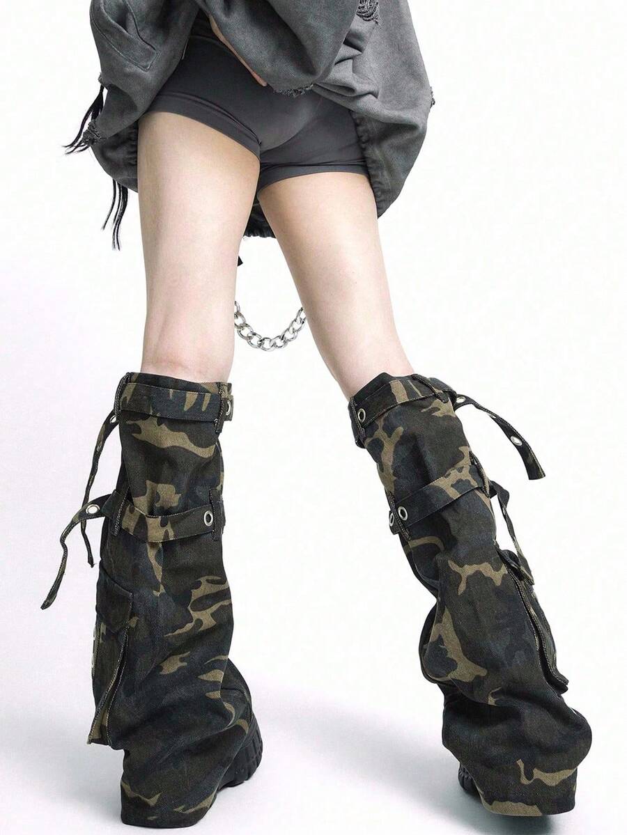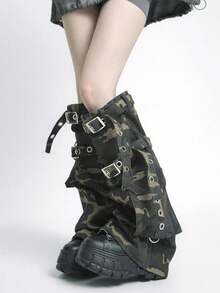 Grunge Punk 1 Pair Of Punk Asymmetrical Camouflage Printed Leg Sleeves, Gothic Fashion Leg Sleeves, With Straps And Horn Design, Suitable For Daily Wear And Holiday Party Dressing, With Metal Buckle Decoration