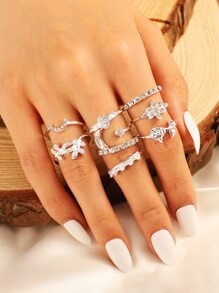 1 Set/9pcs Metal Star, Moon & Flower Shaped Ring Combo
