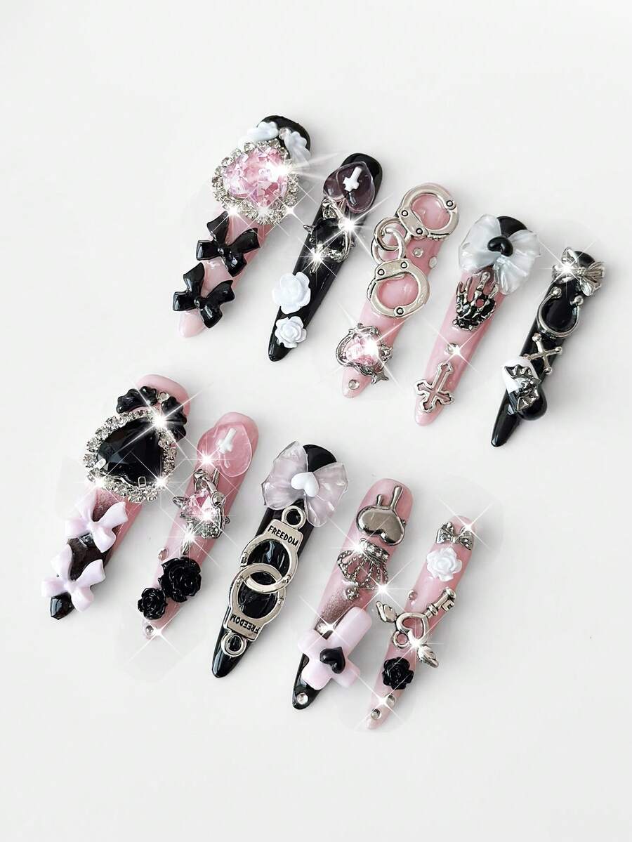 Anime 10 Sweet And Cool Wind Cross Crown Bow Big Love Butterfly Elements High-Quality Handmade Fake Nails + 3 Double-Sided Tape, Y2K Style Black And Pink Two-Color Manicure, Mass-Produced Removable Super Long Almond-Shaped Wearing Armor, Suitable For Holiday Parties, Dances And Daily Wear.