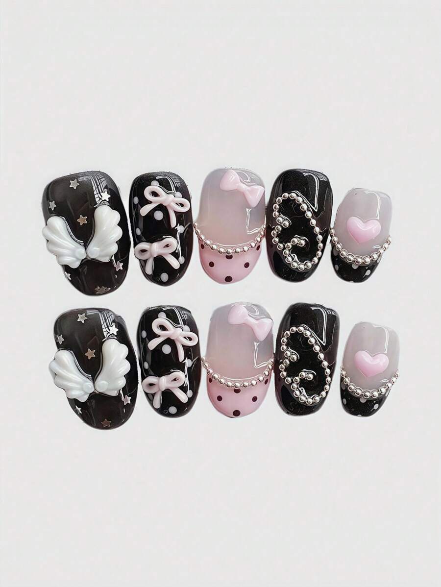 Kawaii 10pcs Cute Angel Wings, Romantic Heart, Ballerina Style Bowknot, White Wings, Gold Vintage Classic Polka Dot Pink Series, Handmade False Nail Patches, Mass-Produced Energetic Girl Wear, Suitable For Daily Outings And Dates