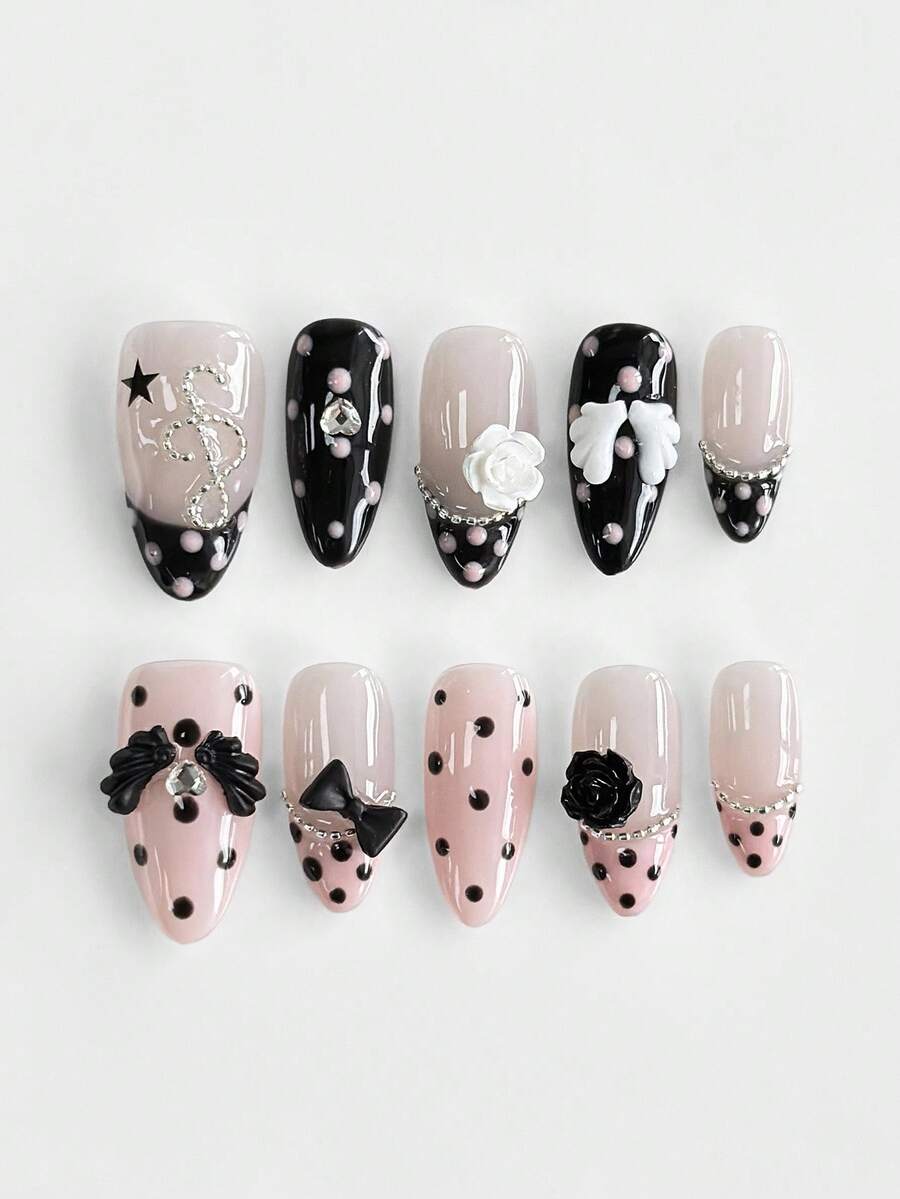 Kawaii 10pcs Dark Style Wing, Music Note, Rose, Bowknot Nail Art Stickers + 3pcs Double-Sided Adhesive, Y2K French Style Rhinestone Chain Polka Dot Detachable Handpainted Nail Stickers, Suitable For Holidays, Parties, Dancing And Daily Wear