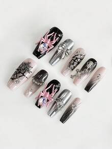 Grunge Punk 10pcs Punk Edgy Spider, Bow, Spider Web, Cross, Star Element Handpainted High-Quality False Nails + 3pcs Double-Sided Adhesive, Removable & Reusable Y2K Style Rhinestone Contrast Color Medium Coffin Fake Nails, Suitable For Holidays, Parties, Dancing And Daily Wear