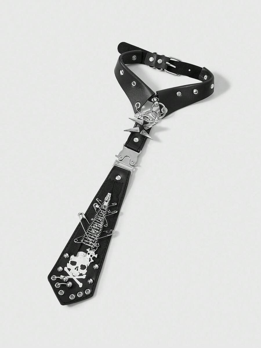 Grunge Punk 1pc Black Y2K Punk Style Rivet Zipper Metal Skull & Letter Print Unisex Necktie, Goth Dark Accessories, Unique Personalized Decor