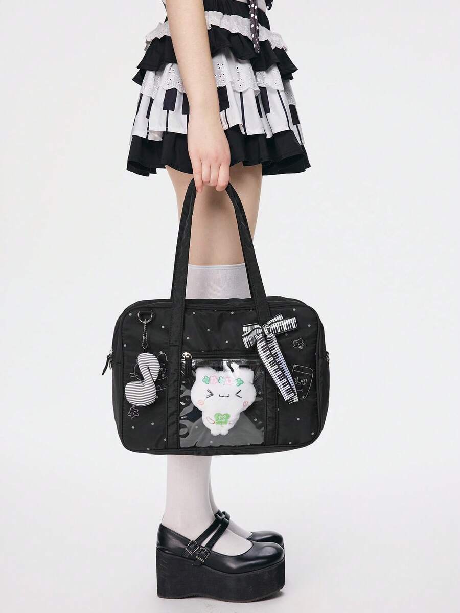 Anime 1pc Cute Sweet Bow Heart Lace Patchwork Polka Dot Pop Art Women Tote Bag, 2nd Gen Snack Quantity Music Note Music Festival Transparent Layer Badge Doll Display Shoulder Bag, Suitable For Shopping, Campus