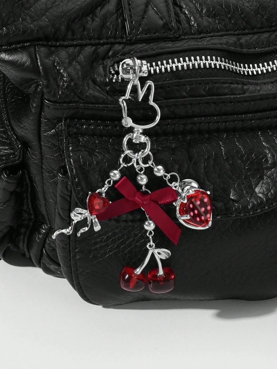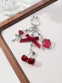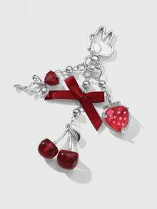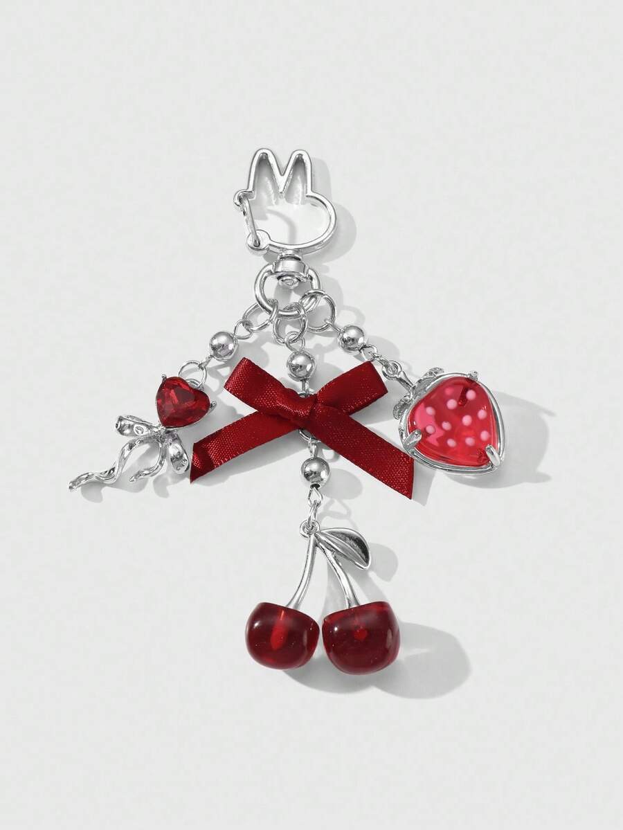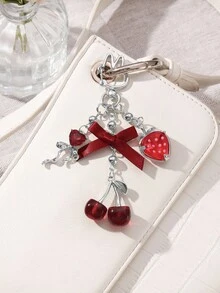 Kawaii 1pc Elegant & Chic Fashionable High-Quality Silver CCB Beaded Ribbon, Crystal Bow, Resin Strawberry & Cherry Pendant DIY Keychain/Bag Charm, Suitable For Women, Girls, Daily Wear, Holiday Gift