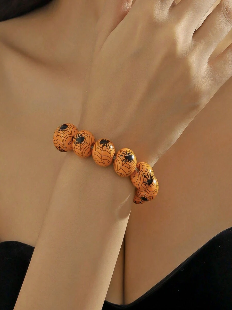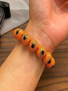 Goth 1pc Funky Wooden Spider Pattern Beaded Bracelet For Women For Halloween