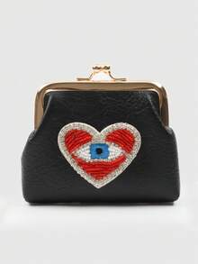 Goth 1pc Gothic Style Blue Eye & Red Heart Beaded Pu Leather Short Wallet For Women