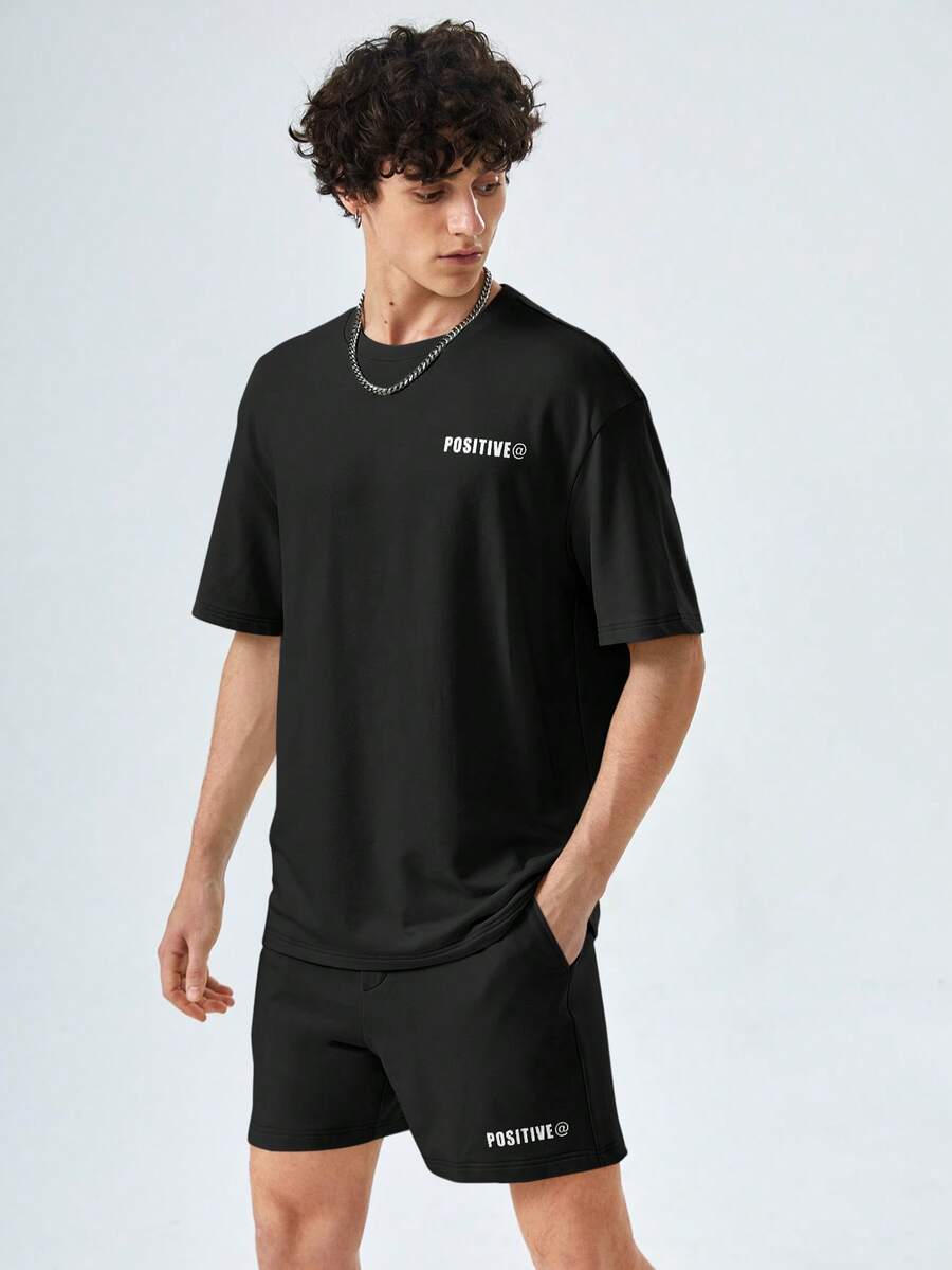 1pc Loose Fit Slogan Graphic T-Shirt & 1pc Drawstring Waist Shorts