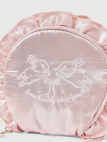 Kawaii 1pc Rabbit Embroidered $Hell Ruffle Cosmetic Jewelry Travel Pouch, Gift Set With Pearl Hanging Decor
