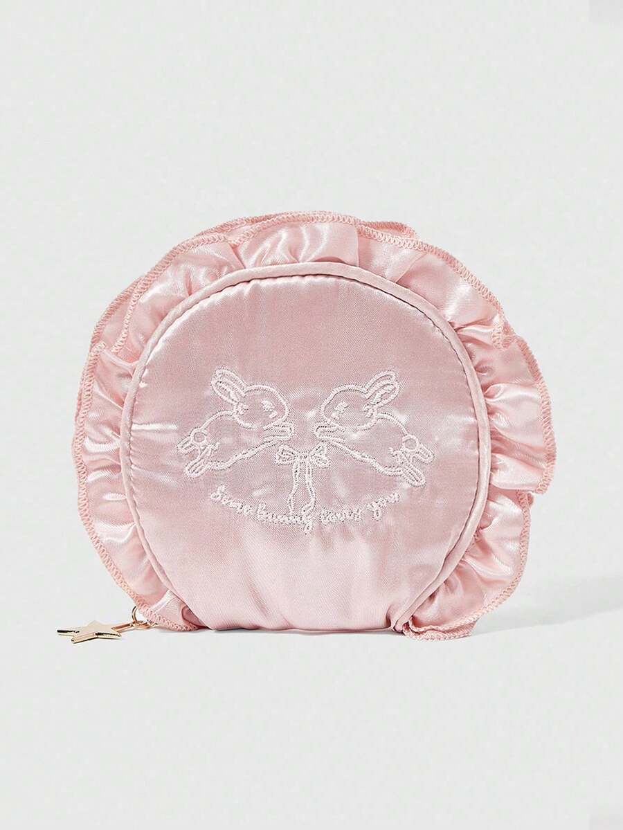 Kawaii 1pc Rabbit Embroidery Shell Ruffle Coin Purse, Travel Makeup Jewelry Pouch Gift With Pearl Hanging Decor