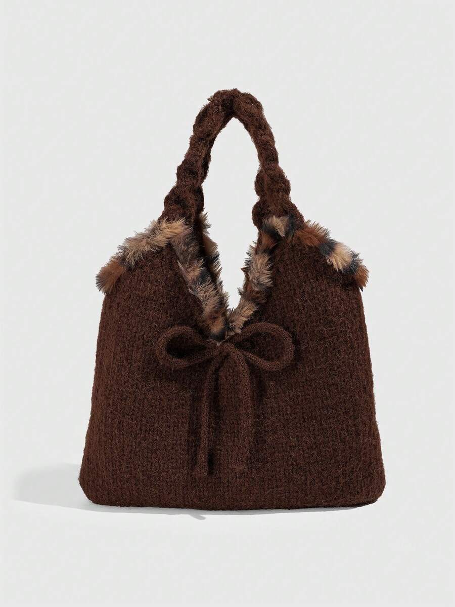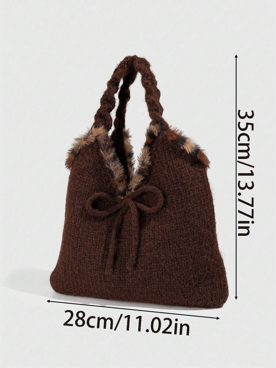 Kawaii 1pc Sweet And Cool Leopard Print Bag With A Brown Single Shoulder Strap, A Vintage Bowknot Handle Knitted Bag, A Cute Autumn And Winter Handbag