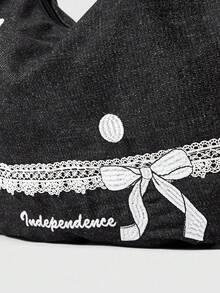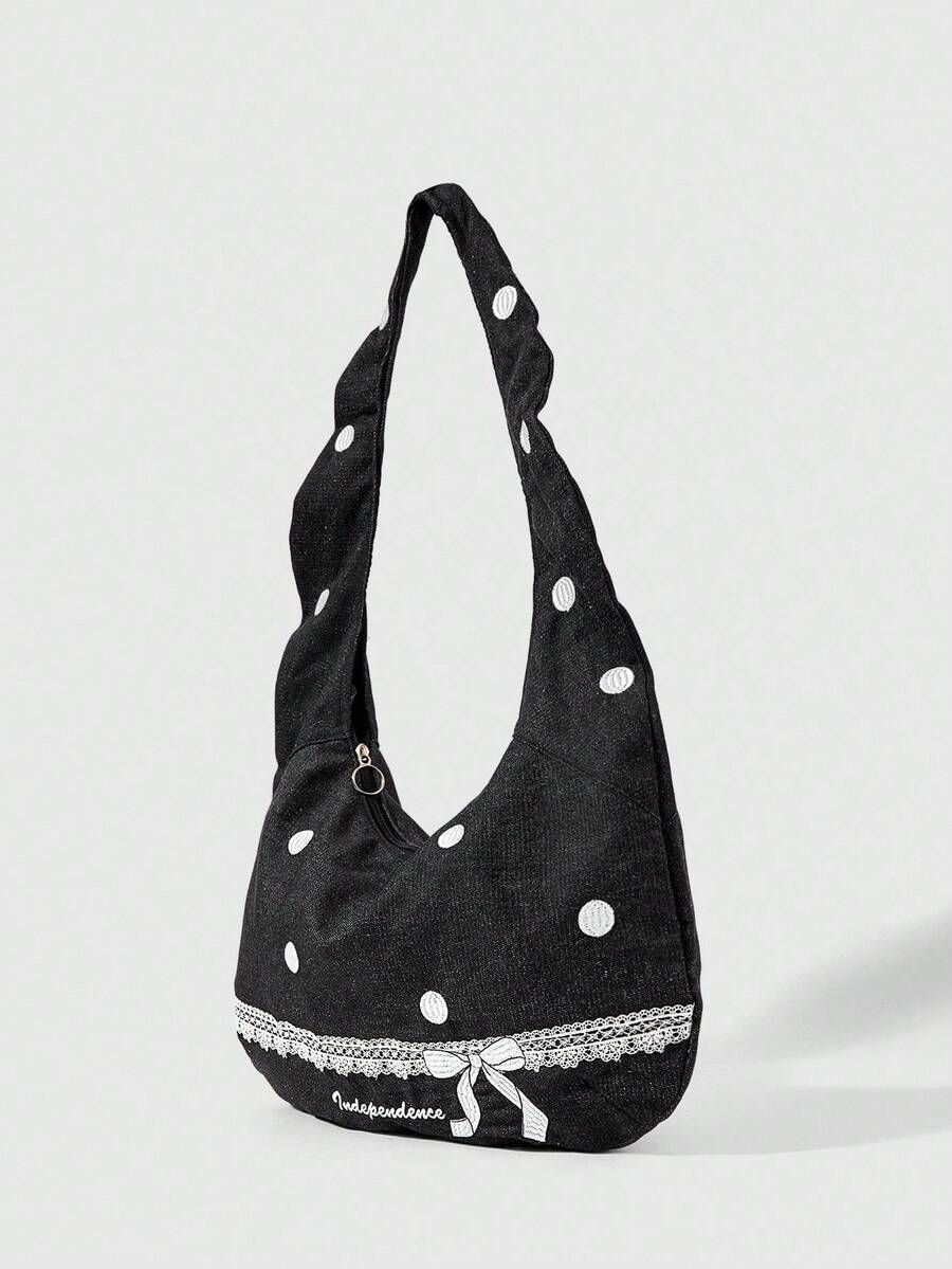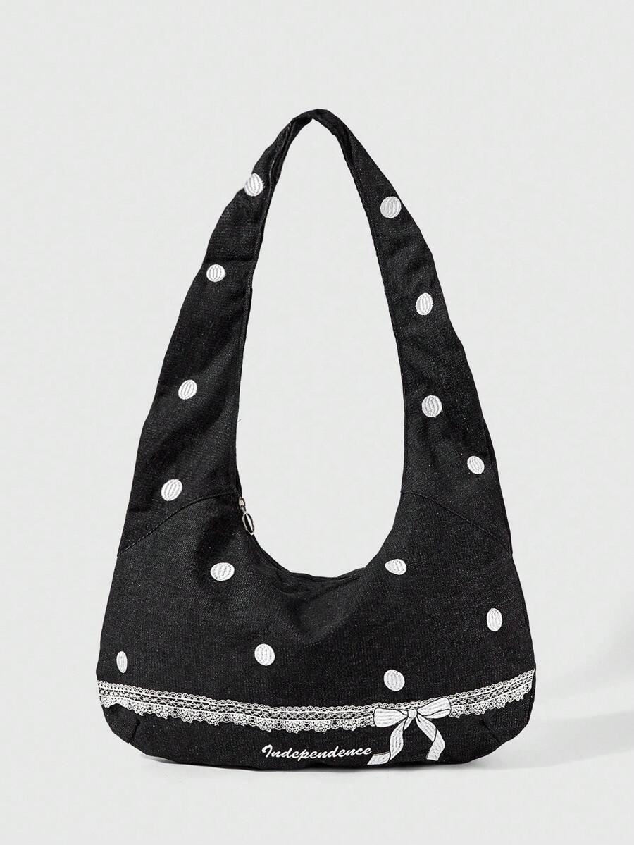 Kawaii 1pc Vintage Minimalist Classic Black & White Polka Dot Embroidered Plain Canvas Shoulder Bag, 1pc Sweet Lady Cute Bowknot Lace Letter Print Large Capacity Tote Bag, Suitable For Daily Commute And Shopping