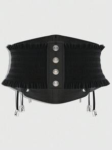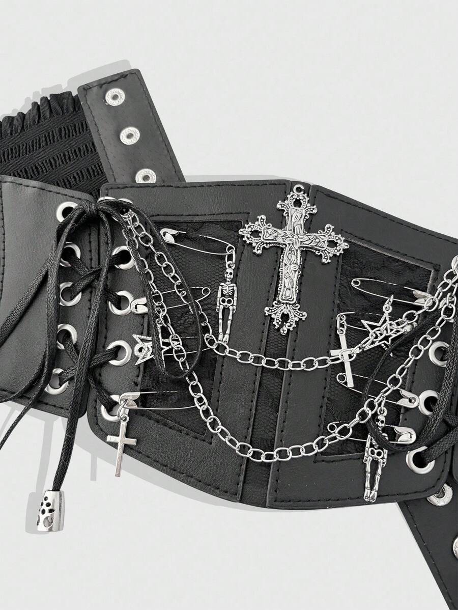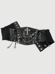 Goth 1pc Women's Black Lace Chain Skeleton Cross Tie Decor Goth Style Elastic Waist Belt Dress Accessory, Halloween Costume Accessory