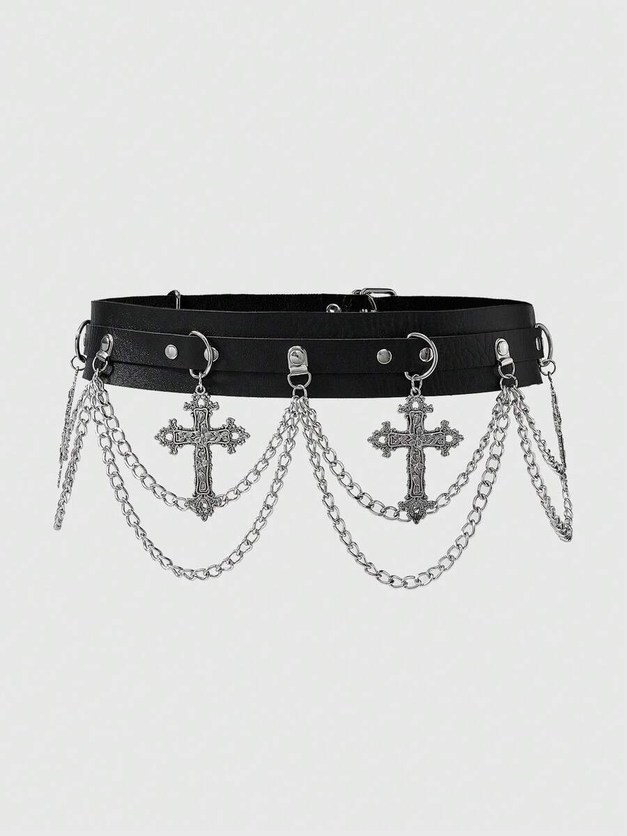 Grunge Punk 1pc Women's Chain Belt & Pants Belt, Black Single-Layer Chain Cross Decor Goth Style Chain Waist Belt, Versatile Accessory For Dress, Halloween