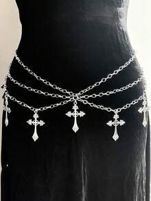 Goth 1pc Women Gothic Style Silver & Black Cross Layered Chain Waist Chain Dress Accessory, Versatile Daily, Halloween
