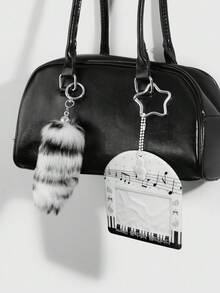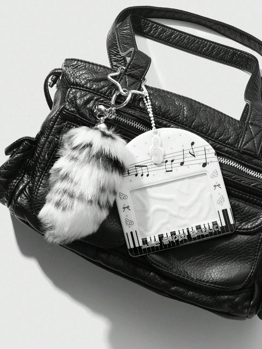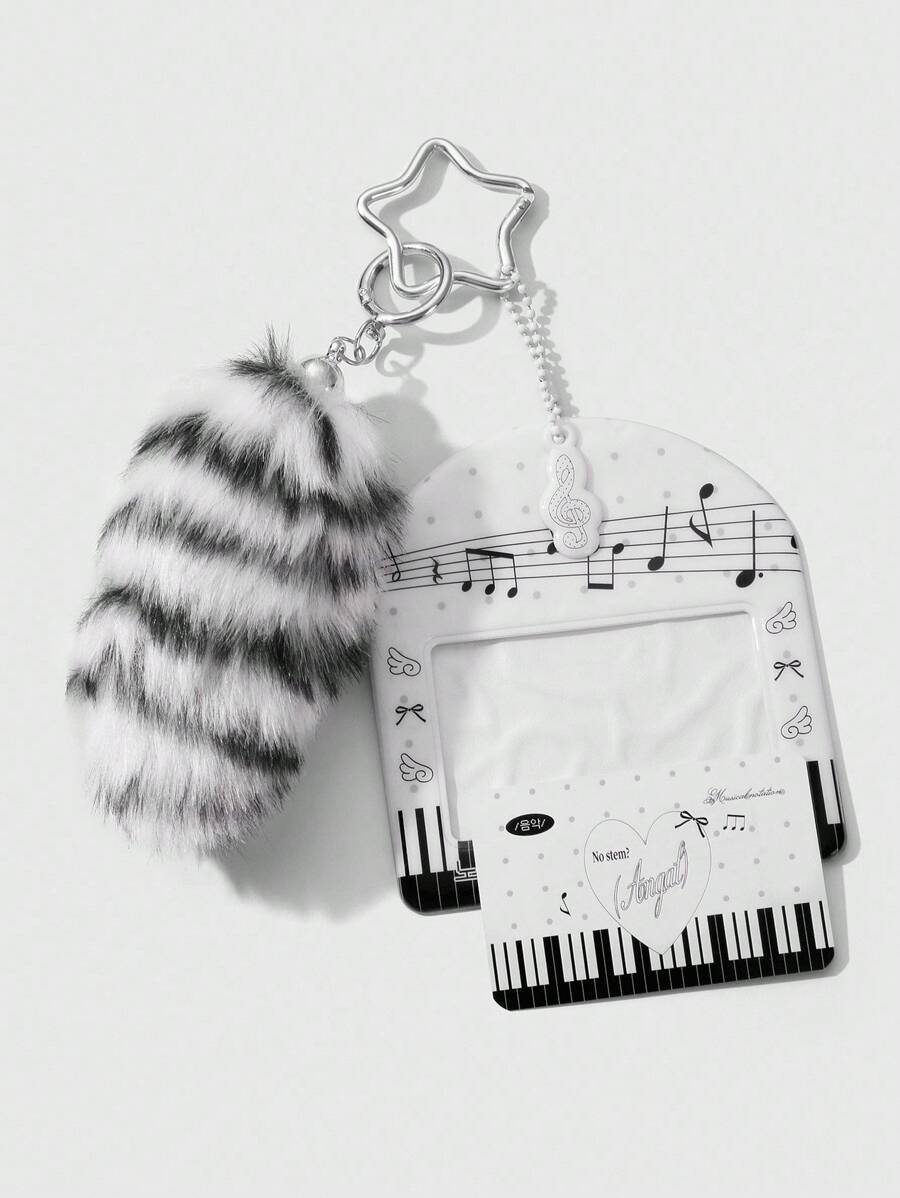 Grunge Punk 1pc Y2K Style Minimalist Retro Chic High-Quality Black & White Gradient Faux Fur Animal Tail Horizontal PVC Card Holder With Pulsing Music Note, Piano Key, Heart Decor, Suitable For Office Workers, Students, Daily Wear, Holiday Gift