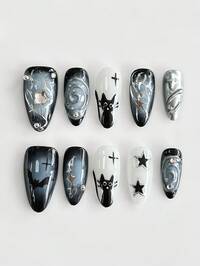 Goth 10pcs Y2K Style Star Element Handpainted High-Quality Press-On Nails + 3 Sheets Double-Sided Tape, Nail Rhinestone & Glitter Decals, Reusable Nail Art Stickers Suitable For Holidays, Parties, Dancing, & Daily Wear