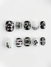 Anime 10pcs Cute Star, Music Note, Bow Accent Artificial Nails + 3pcs Double-Sided Adhesive, Removable Geometric Pattern, Line, Polka Dot Nail Art Stickers, High-Quality Rhinestone Decor Colorful Manicure, Suitable For Holidays, Parties, Dancing And Daily Wear