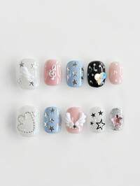Kawaii 10pcs Dark Style Wings, Stars, Bow, Music Note Decor High-Quality Handmade False Nails + 3pcs Double-Sided Adhesive, Y2K Blue Polka Dot Removable Nail Art Stickers, Suitable For Festivals, Parties, Dancing And Daily Wear
