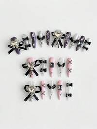 Kawaii 10pcs Sweet And Cool Wind Diamond Heart Handmade Fake Nails + 3pcs Double-Sided Stickers, Detachable Hand-Painted Bowknot Nail Stickers, High-Quality Glossy Contrast Colored Nail, Suitable For Festival, Party, Dancing And Daily Wear