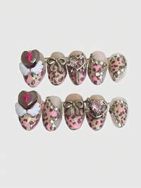 10 Pcs High-Quality Handmade Bowknot False Nails + 3 Sheets Double-Sided Adhesive, Cute Rhinestone Heart Nail Stickers, Detachable Bowknot & Heart Design, Suitable For Holiday Parties, Dancing, And Daily Wear Fake Nails, Press On Nails