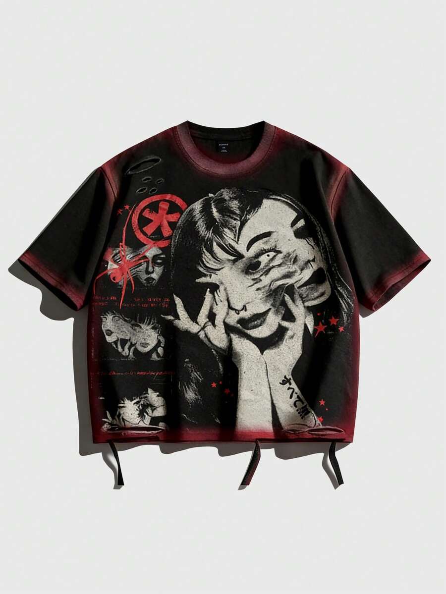 Anime 2026 Men's Casual Fashion Short Sleeve T-Shirt Top, Distressed Artistic Design, Summer; Women's Street Style Round Neck T-Shirt