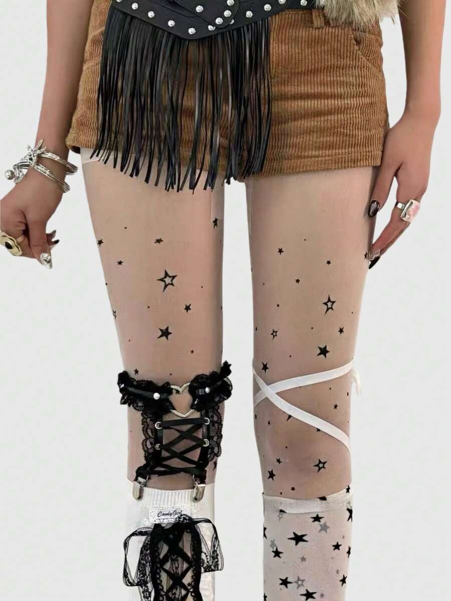 2Pair Of Black And White Y2K Millennium Spice Girls Star-Printed One-Piece Socks And Sexy French Sweet And Cute Lace Strap Calf Socks Combination, Matching Thigh Chain Decoration, Suitable For College, Shopping, Commuting, Music Festivals, Etc