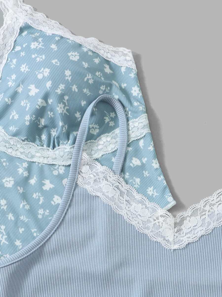 2pcs Ditsy Floral Contrast Lace Cami Top & 1pc Tank Top
