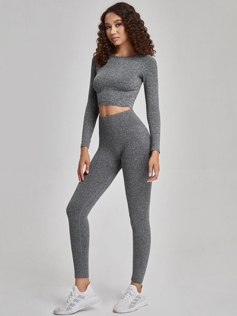 2pcs Marled Knit Seamless Mono Fitness Set Yoga Suit Cropped Tee & Wide Waistband Leggings
