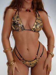 2pcs/Set Black & Gold Foil Fabric Sexy Side Ring Chain Drawstring Bikini Set Set, Spring/Summer 2026