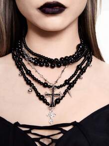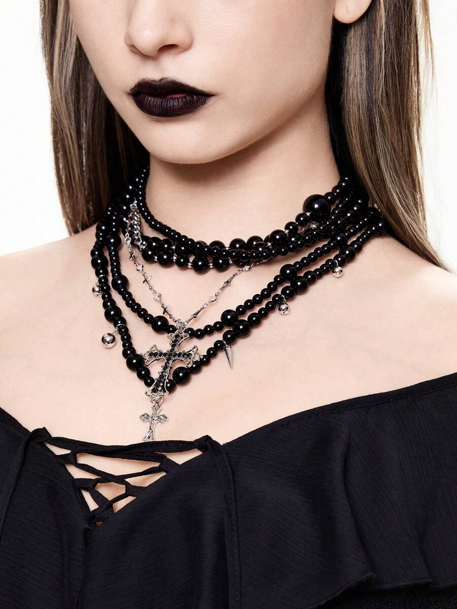 2pcs Set Goth Multi-Layer Black Beaded Necklace, Asymmetrical Beads, Rivets, Star Shaped Necklace, Rhinestone Cross Pendant, Fashionable Personalized High-End Jewelry For Men And Women
