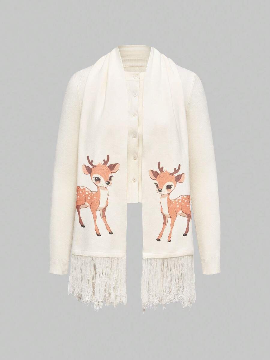 Fairycore 2pcs Women's Deer Pattern Scarf And Cardigan Set