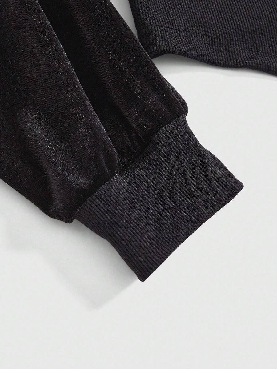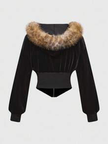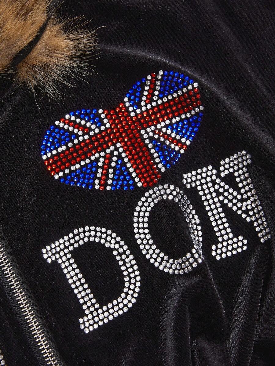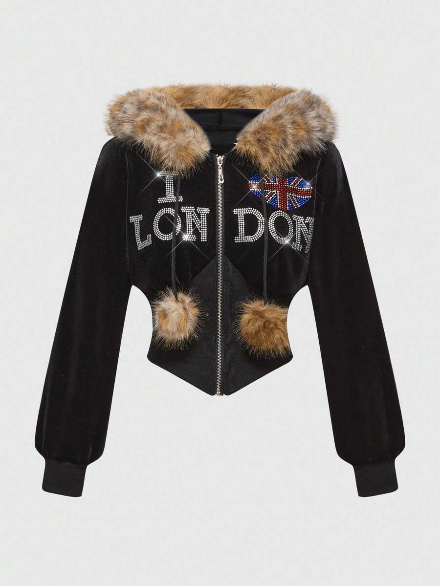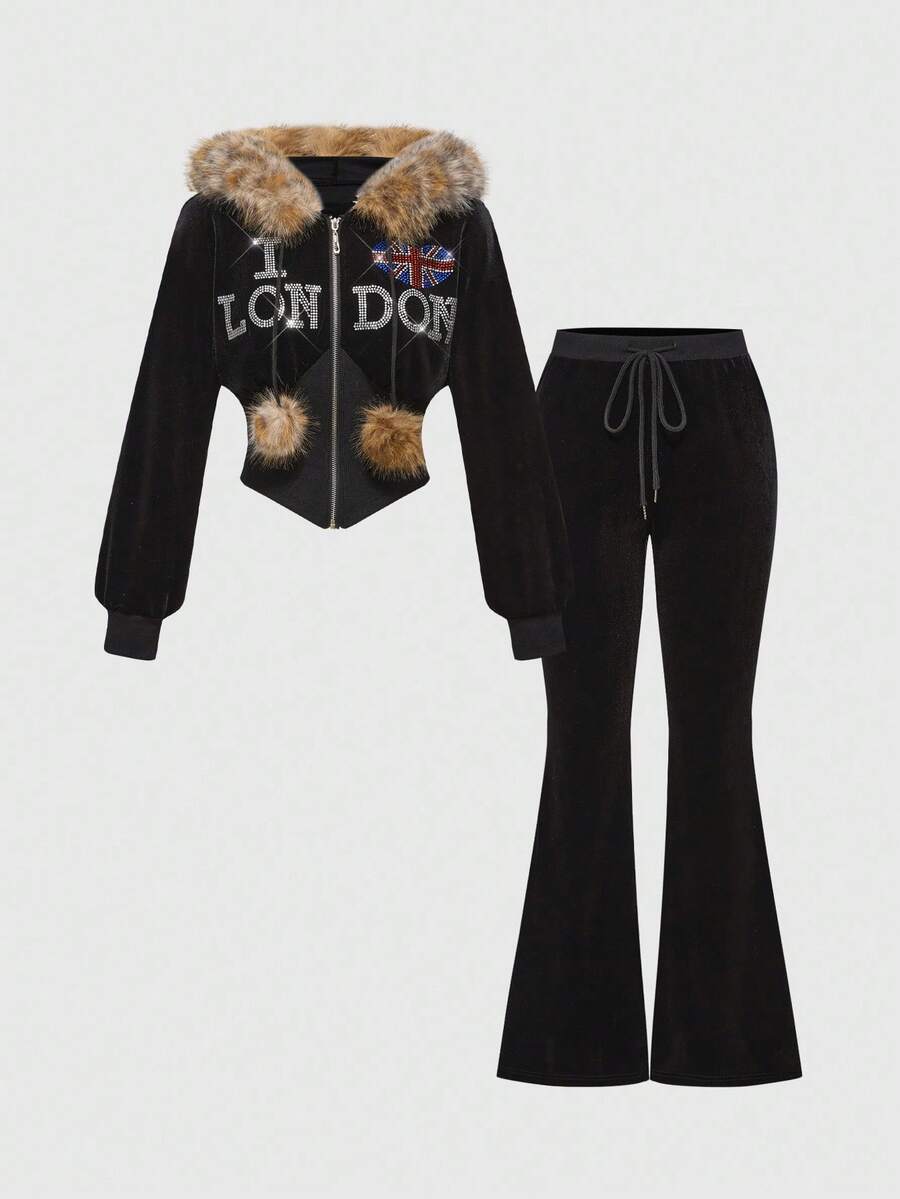J-Fashion 2pcs Y2K Velvet Rhinestone Patchwork Hoodie With Fur Collar Sweatshirt Set For Women, Autumn/Winter