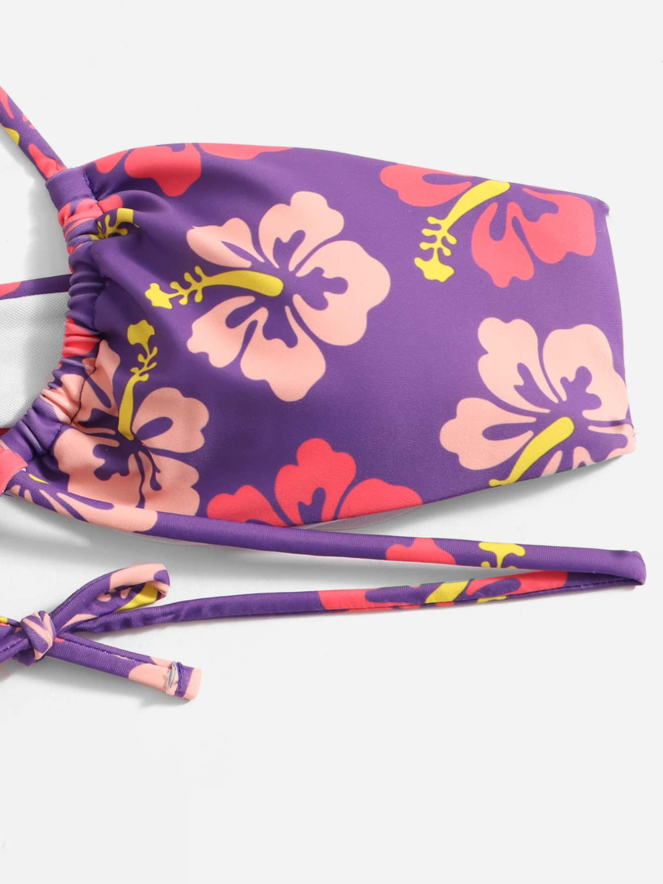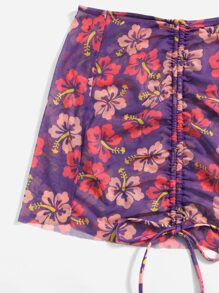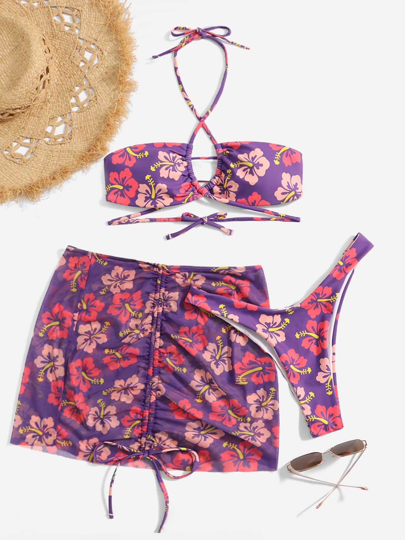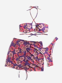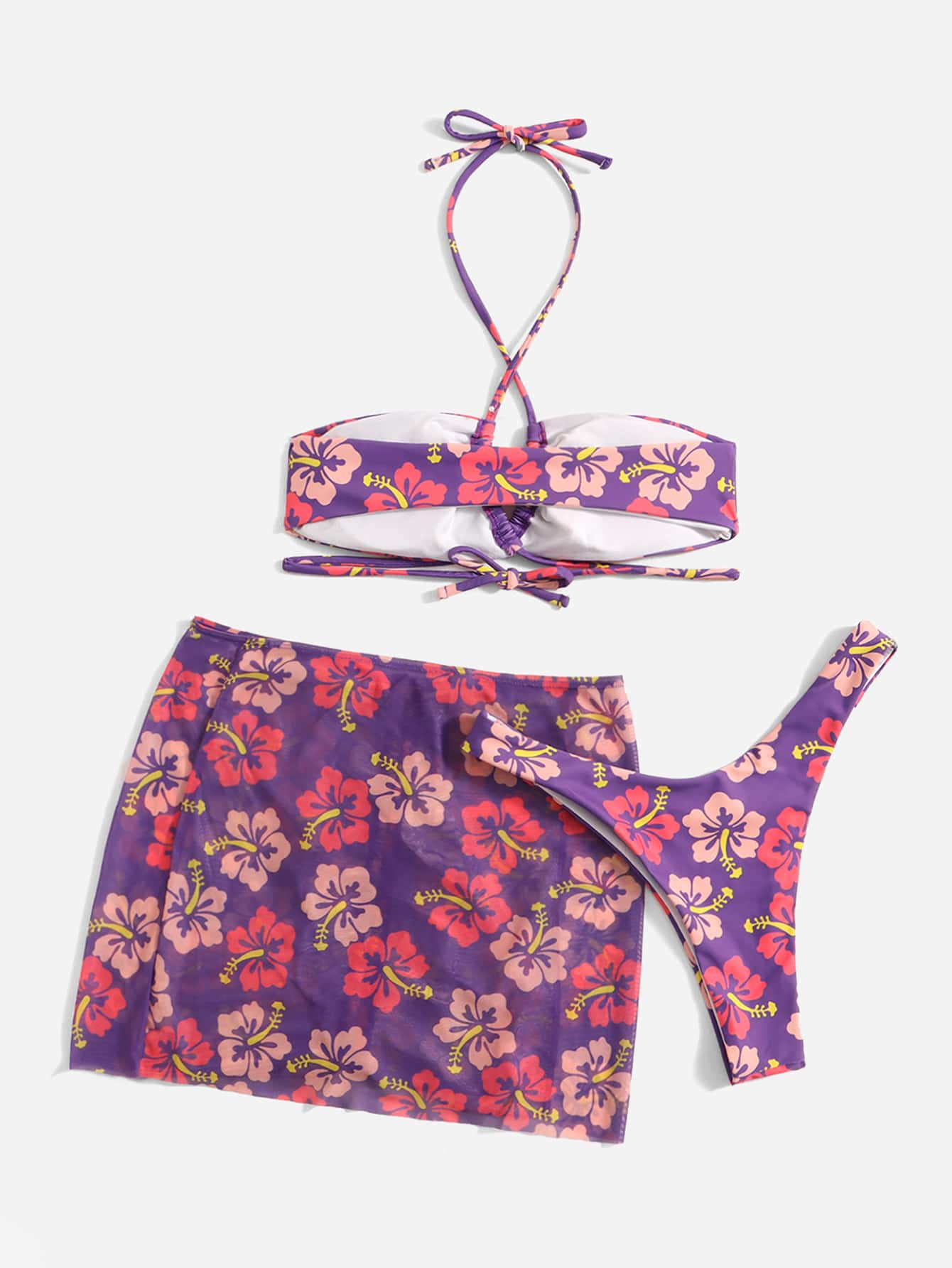 3packs Floral Print Halter High Cut Bikini & Beach Skirt