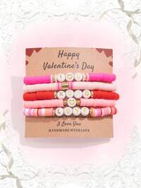 Kawaii 6pcs Sweet & Cute Heart Shaped Beaded Soft Clay Bracelet Set For Women, Ideal For Daily Wear, Friends' Gathering And Valentine's Day Gift (Bracelet+Card)