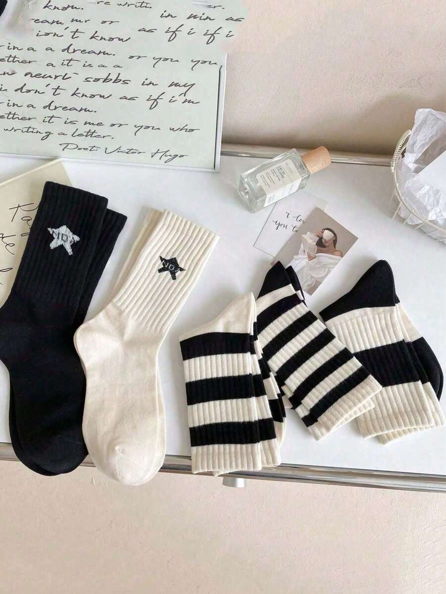 5pairs Autumn & Winter Women's High Elasticity Simple Striped Athletic Socks With Star Applique - Black & White Mid-Calf Length, Fall