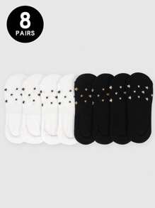 8 Pairs Women Star Print Invisible Socks, Solid Black & White, Fashionable Casual Short Socks For School Style, Spring/Summer