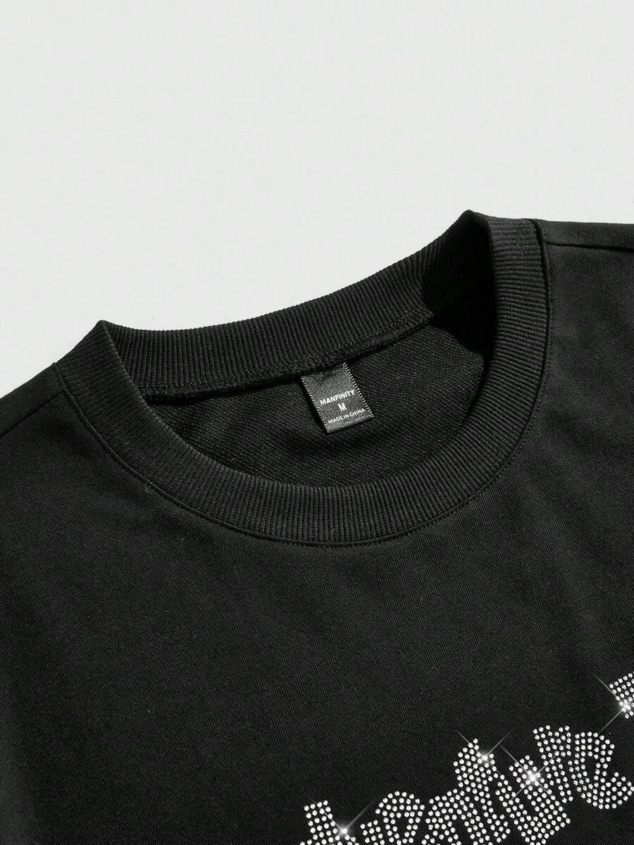 Adventure Time X ROMWE Men's Loose Rhinestone Embellished Cartoon & Letter Graphic Drop Shoulder Black T-Shirt