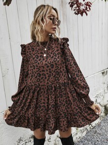 Allover Print Frill Mock Neck Babydoll Dress Casual