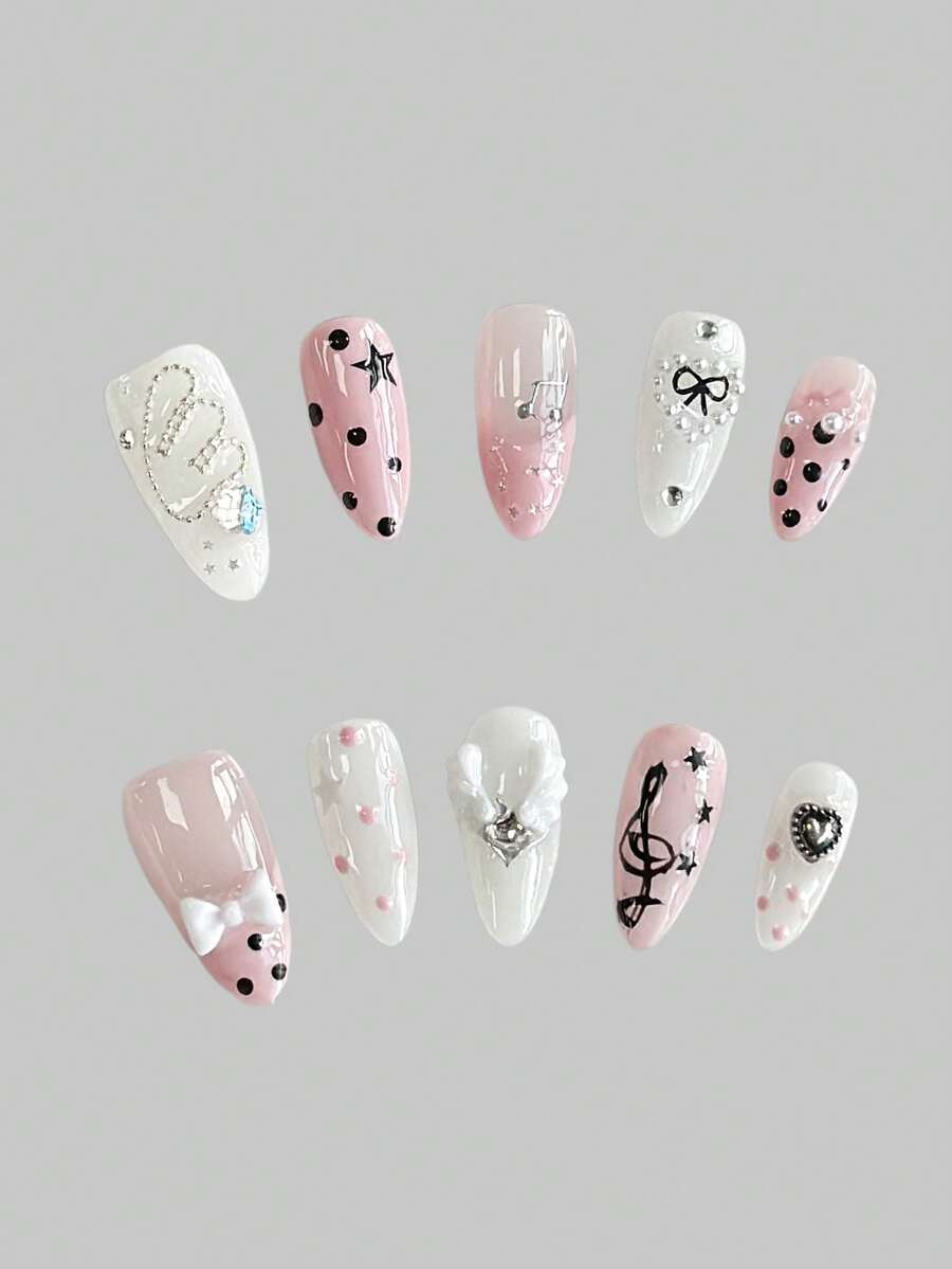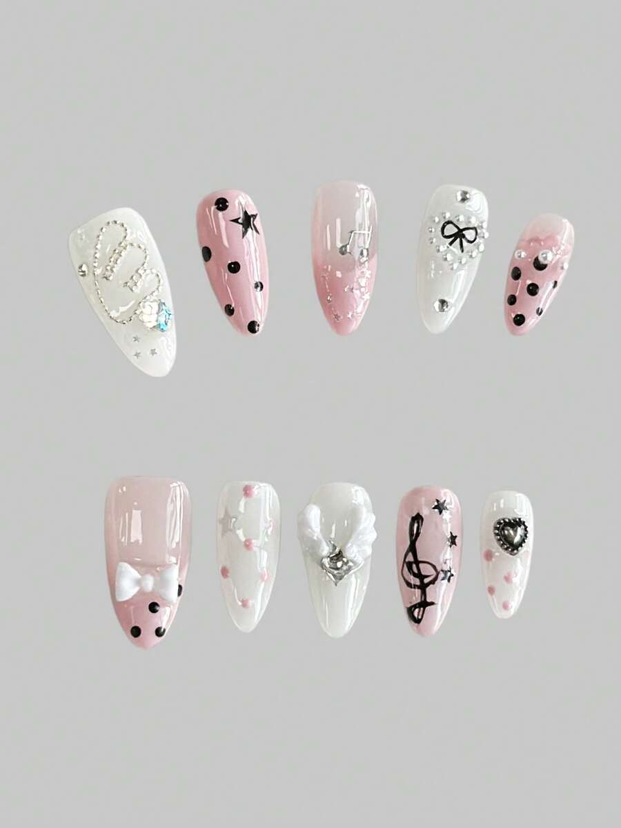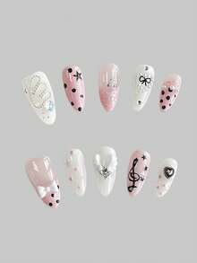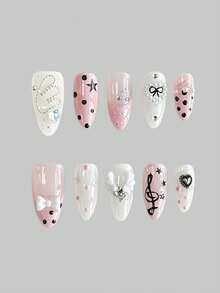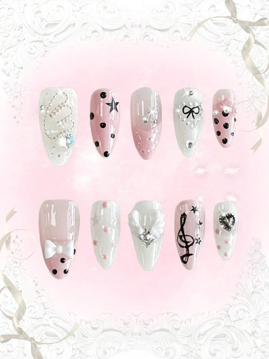 Anime 10pcs Cute Bowknot Music Note Star Element High Quality Handmade False Nails + 3pcs Double-Sided Adhesive, Y2K French Style Rhinestone Chain Polka Dot Removable Nail Art Stickers, Suitable For Holidays, Parties, Dancing And Daily Wear