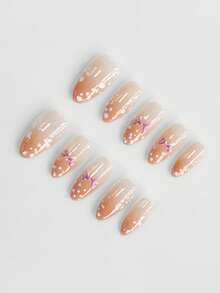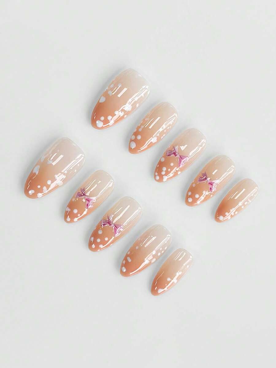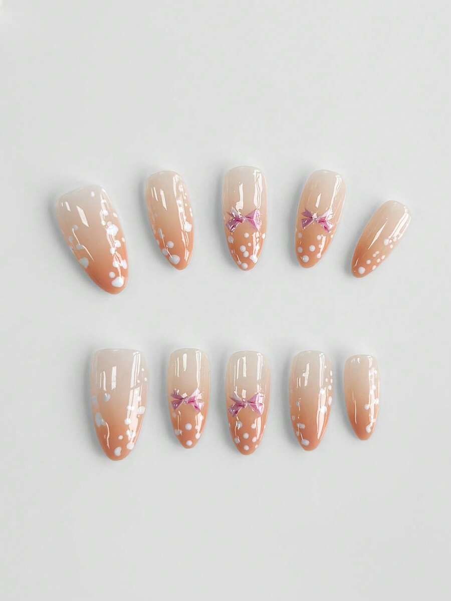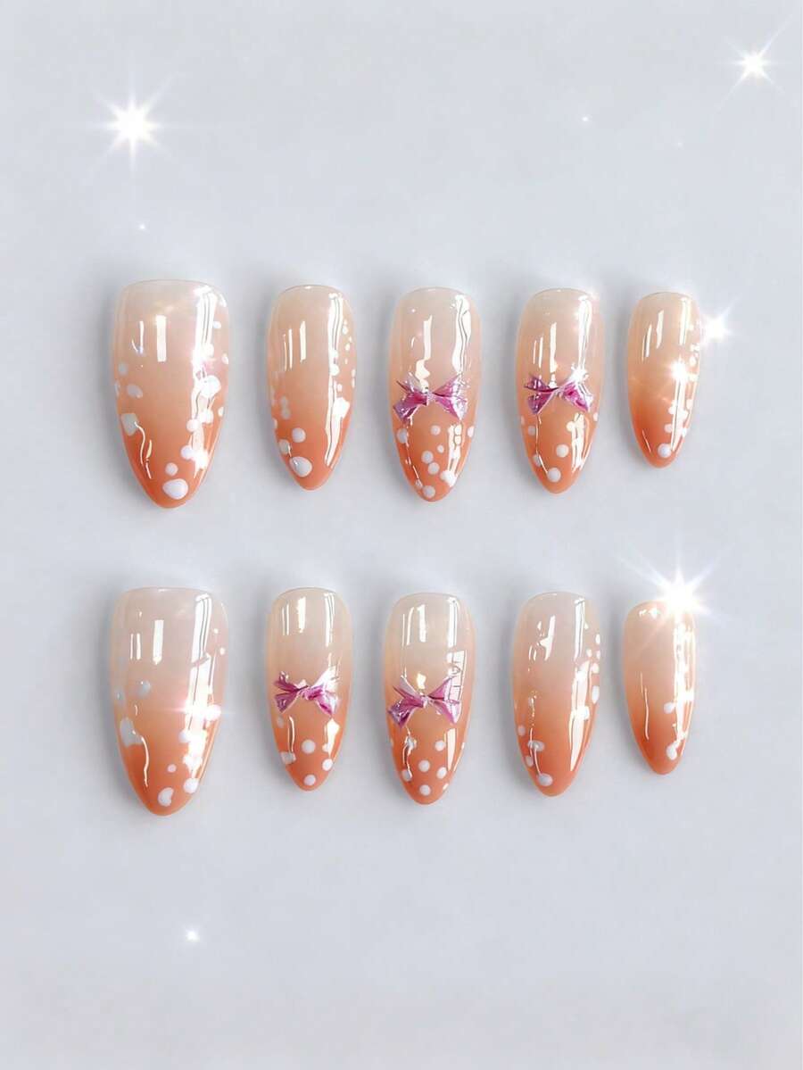 Anime 10pcs Cute Bowknot Music Note Star Element High Quality Handmade False Nails + 3pcs Double-Sided Adhesive, Y2K French Style Rhinestone Chain Polka Dot Removable Nail Art Stickers, Suitable For Holidays, Parties, Dancing And Daily Wear