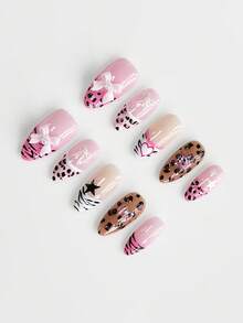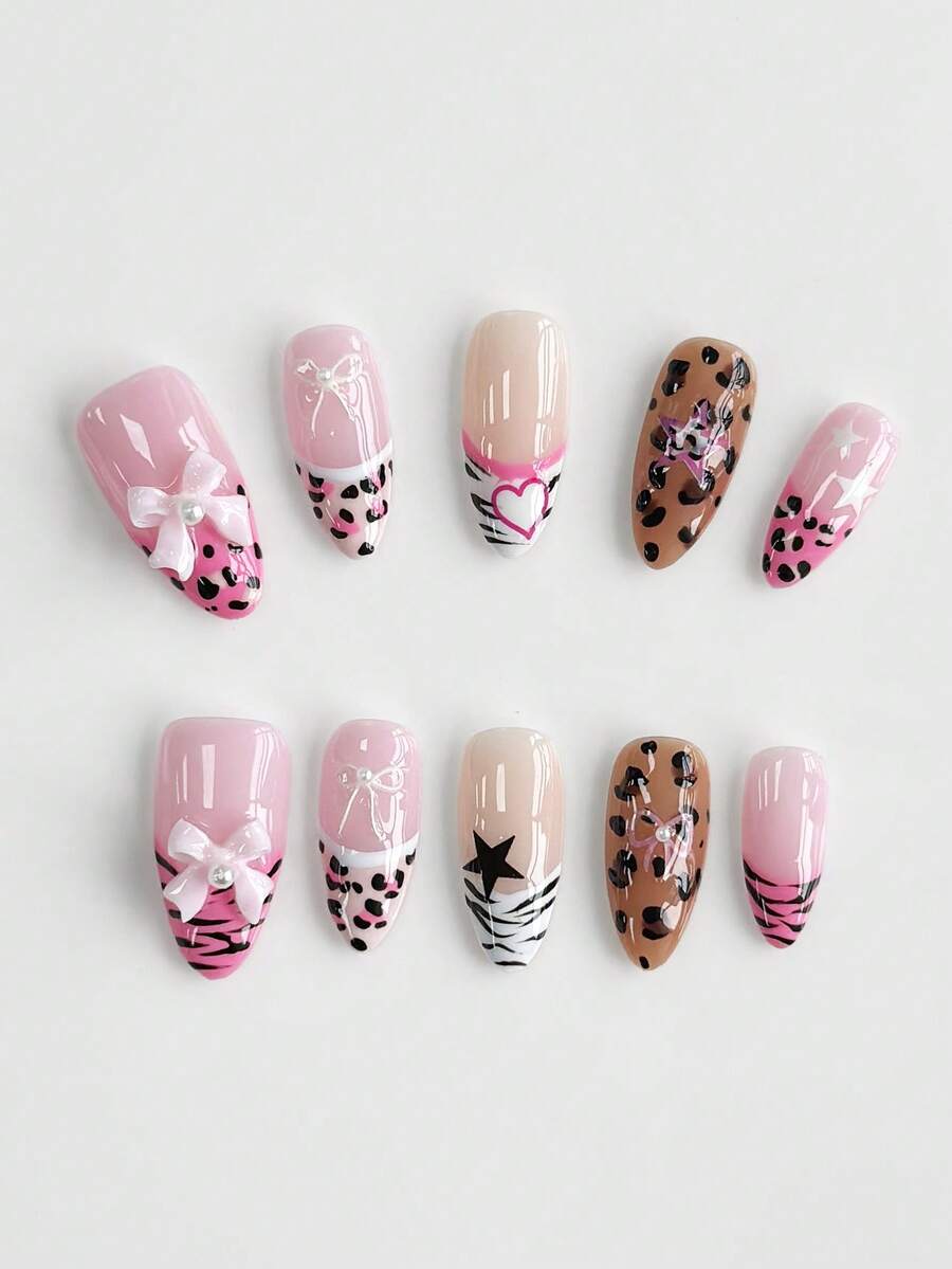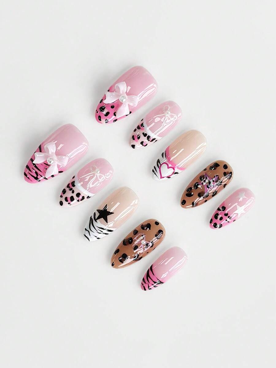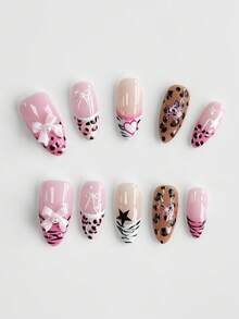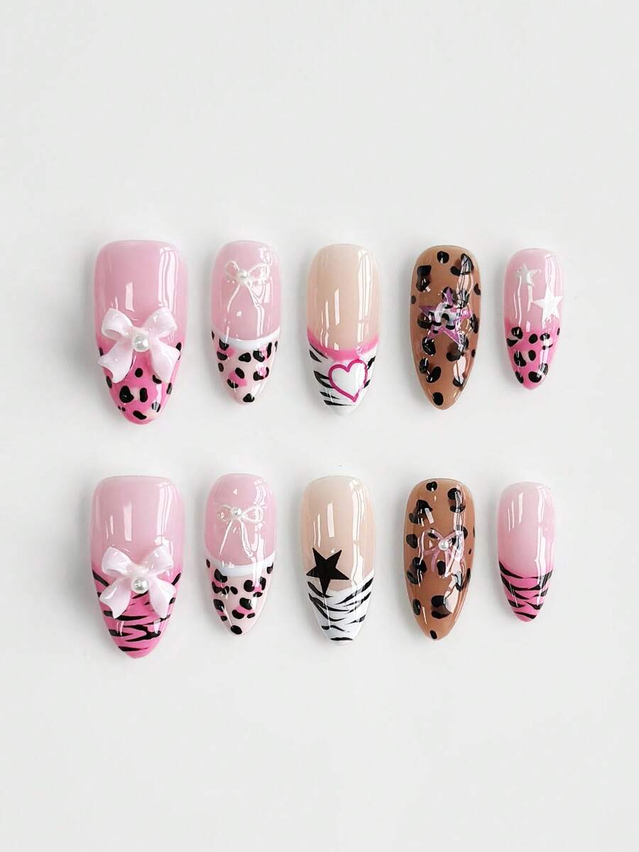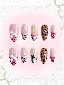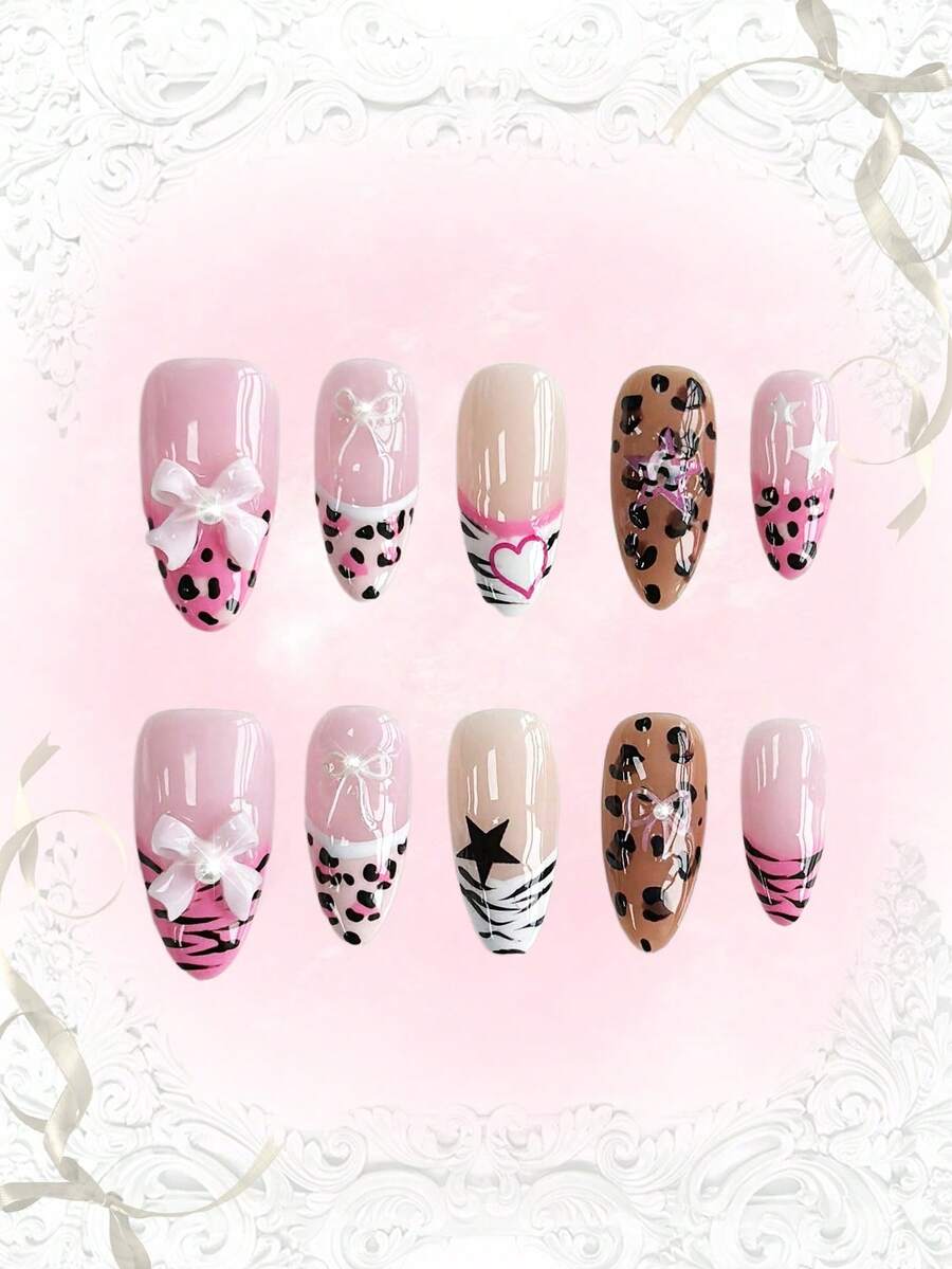 Anime 10pcs Cute Bowknot Music Note Star Element High Quality Handmade False Nails + 3pcs Double-Sided Adhesive, Y2K French Style Rhinestone Chain Polka Dot Removable Nail Art Stickers, Suitable For Holidays, Parties, Dancing And Daily Wear
