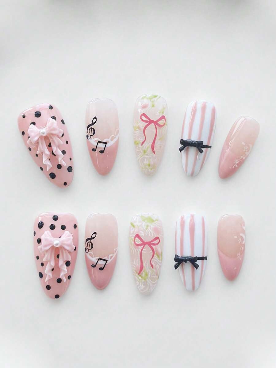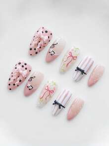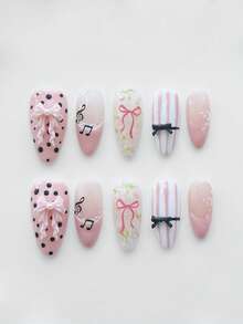 Anime 10pcs Cute Bowknot Music Note Star Element High Quality Handmade False Nails + 3pcs Double-Sided Adhesive, Y2K French Style Rhinestone Chain Polka Dot Removable Nail Art Stickers, Suitable For Holidays, Parties, Dancing And Daily Wear