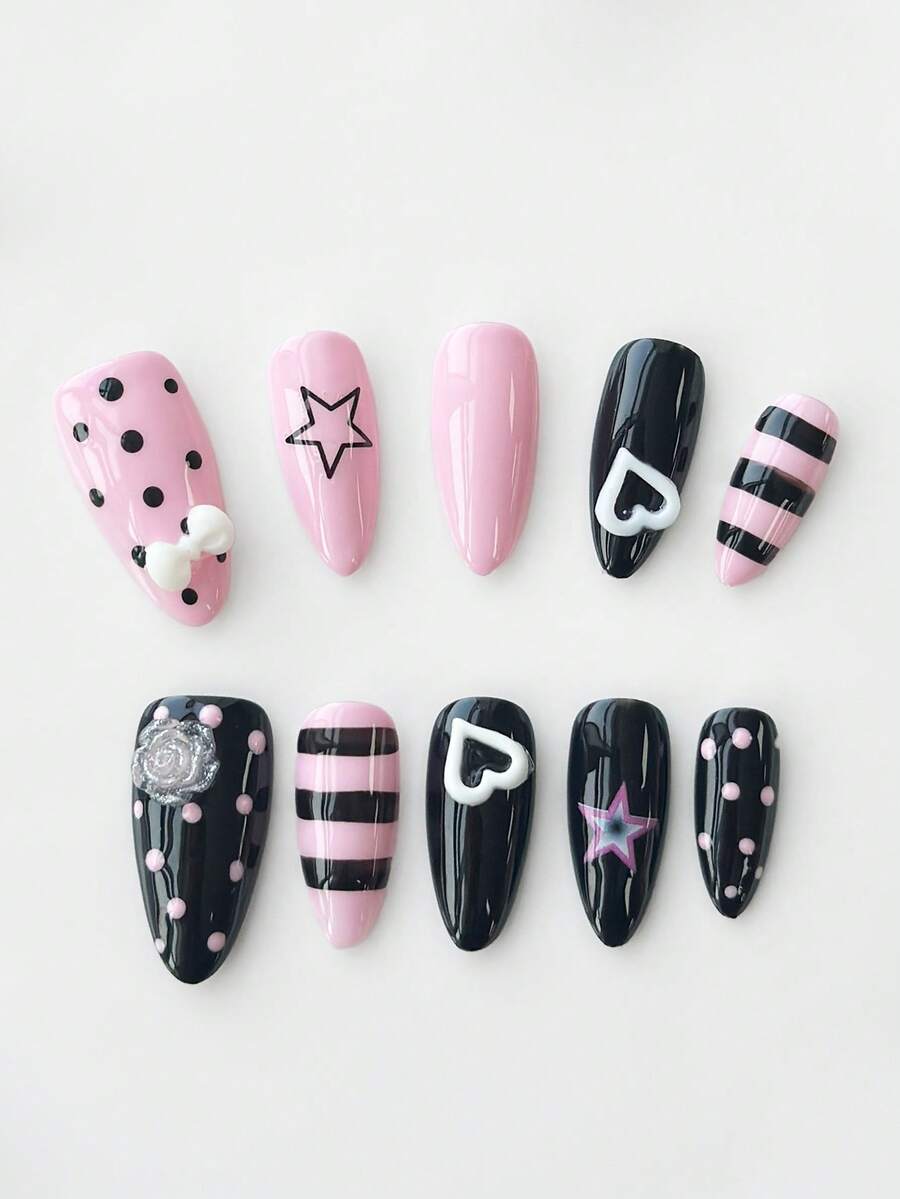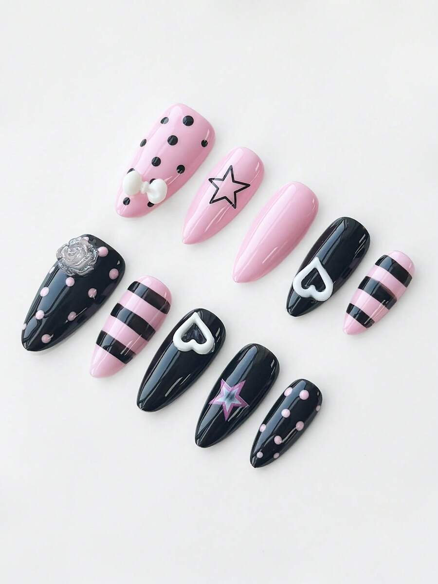 Anime 10pcs Cute Bowknot Music Note Star Element High Quality Handmade False Nails + 3pcs Double-Sided Adhesive, Y2K French Style Rhinestone Chain Polka Dot Removable Nail Art Stickers, Suitable For Holidays, Parties, Dancing And Daily Wear