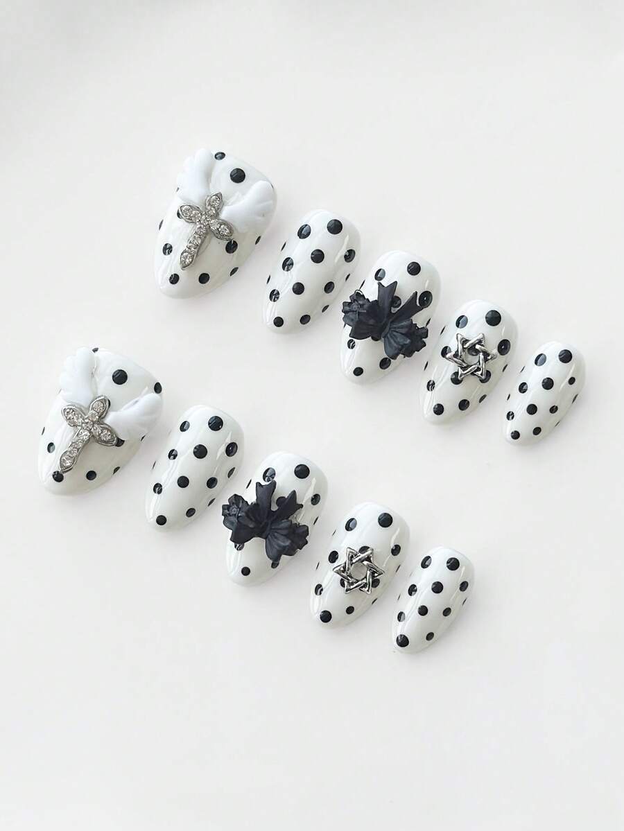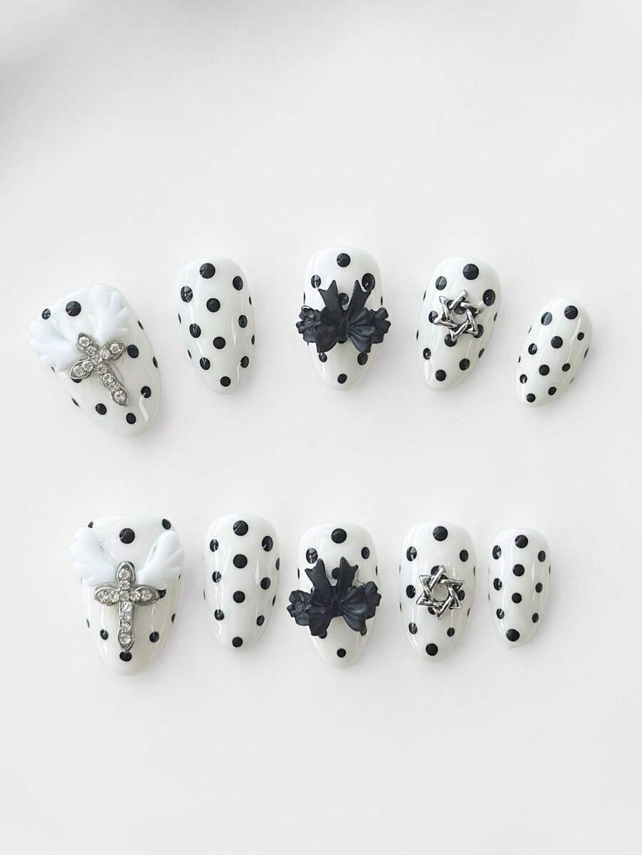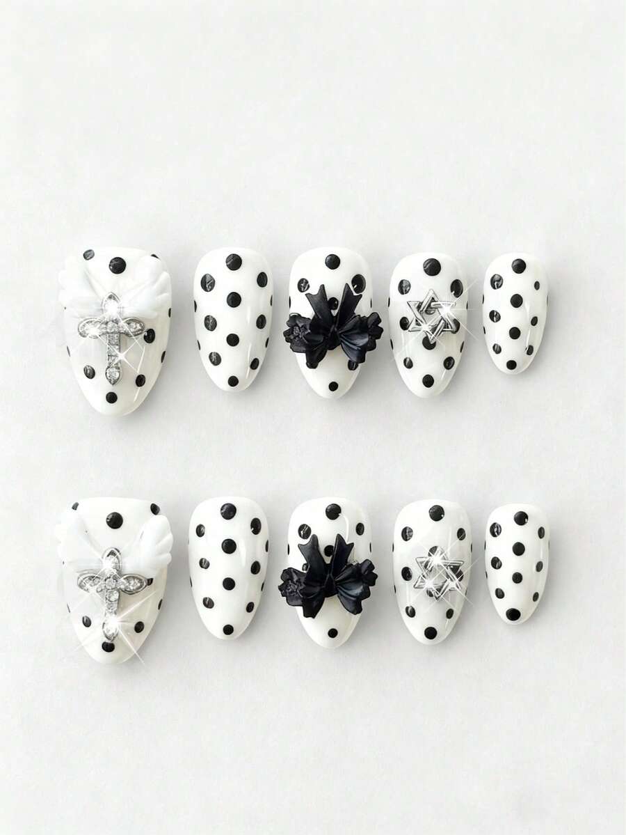 Anime 10pcs Cute Bowknot Music Note Star Element High Quality Handmade False Nails + 3pcs Double-Sided Adhesive, Y2K French Style Rhinestone Chain Polka Dot Removable Nail Art Stickers, Suitable For Holidays, Parties, Dancing And Daily Wear