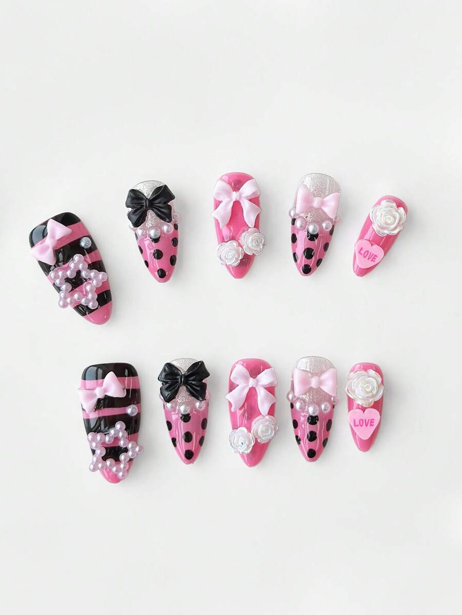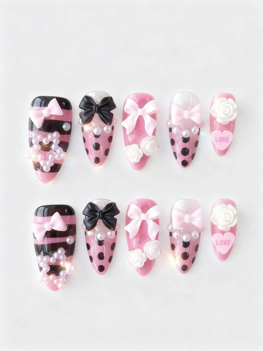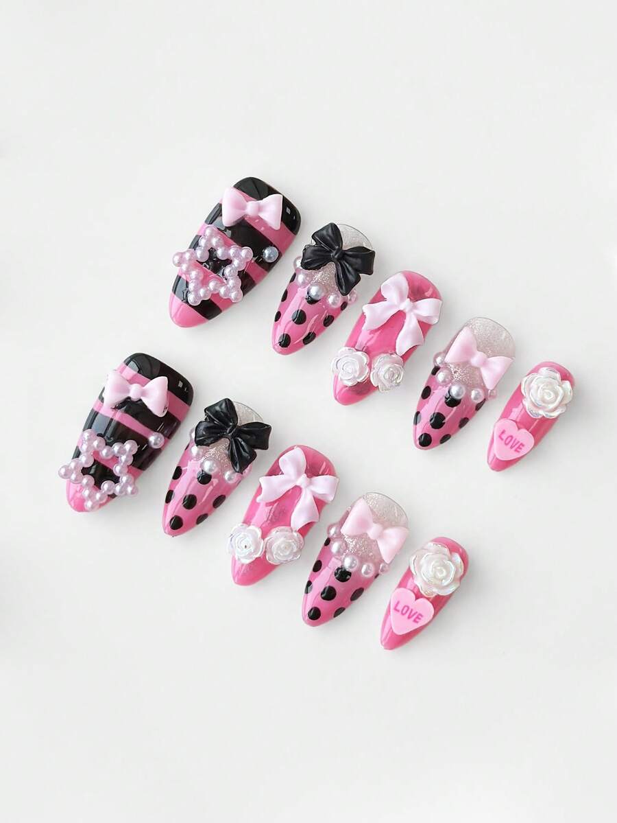 Anime 10pcs Cute Bowknot Music Note Star Element High Quality Handmade False Nails + 3pcs Double-Sided Adhesive, Y2K French Style Rhinestone Chain Polka Dot Removable Nail Art Stickers, Suitable For Holidays, Parties, Dancing And Daily Wear