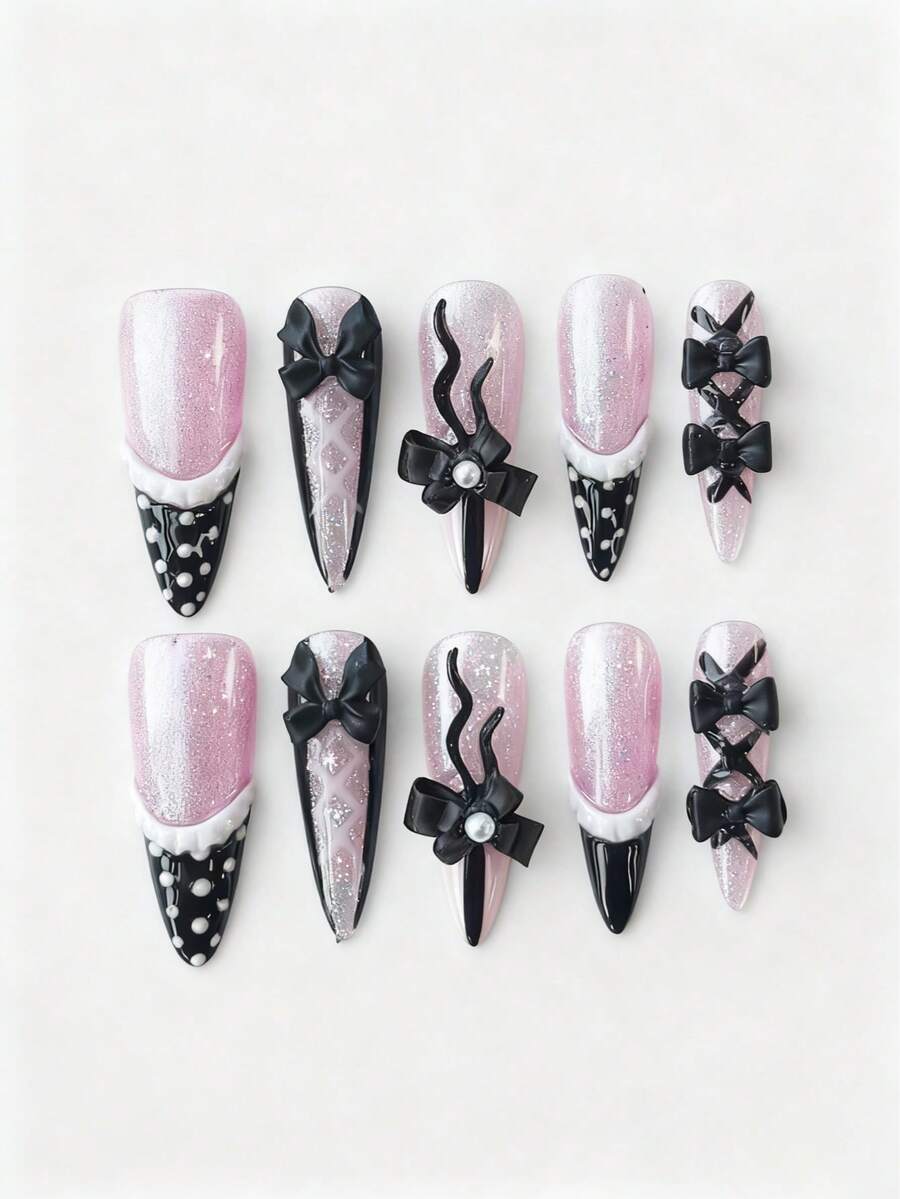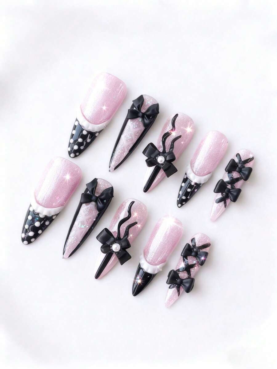 Anime 10pcs Cute Bowknot Music Note Star Element High Quality Handmade False Nails + 3pcs Double-Sided Adhesive, Y2K French Style Rhinestone Chain Polka Dot Removable Nail Art Stickers, Suitable For Holidays, Parties, Dancing And Daily Wear