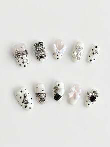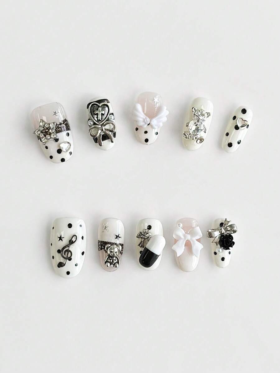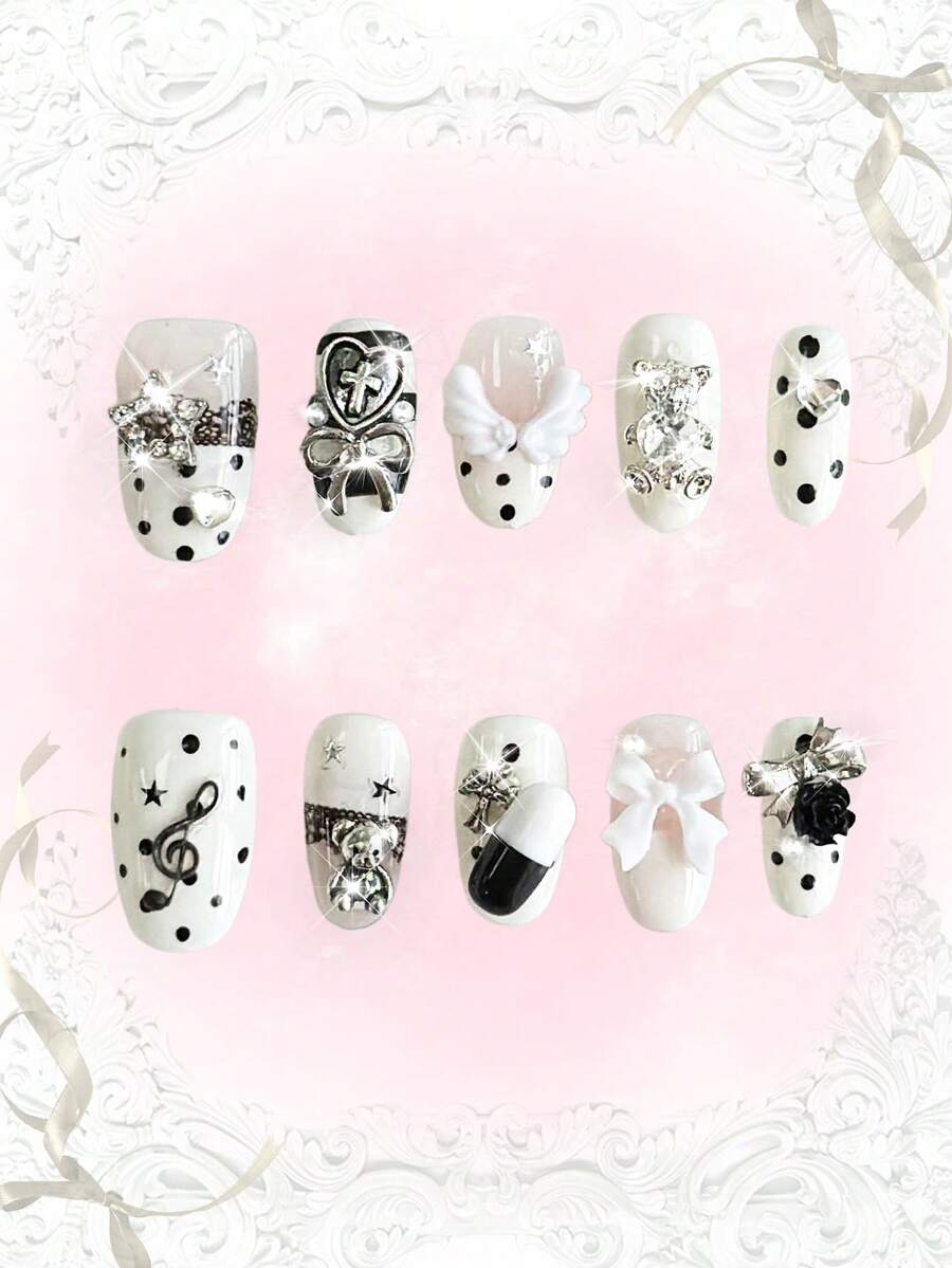 Anime 10pcs Cute Wing, Chain, Music Note, Star, Clover Element High Quality Handmade False Nails + 3pcs Double-Sided Adhesive, Y2K French Style Rhinestone Chain Polka Dot Removable Nail Art Stickers, Suitable For Holidays, Parties, Dancing And Daily Wear