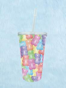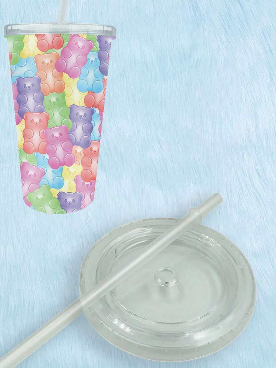 Anime 1pc Straw Tumbler,Cute Cartoon Bear Pattern Washable Bottle With Lid
