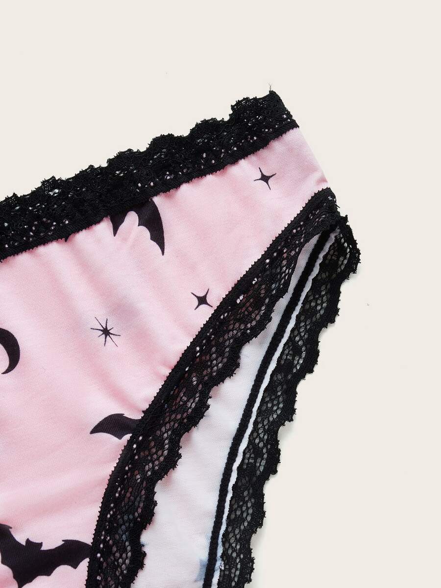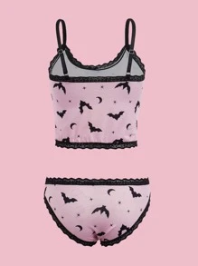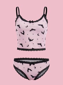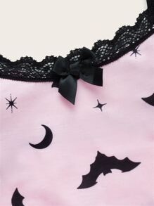 Anime Bat Print Contrast Lace Bow Decor Lingerie Set